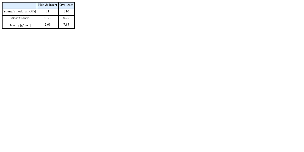 Fig. 4와 같이 각 부분의 접촉 서피스를 정의하고, 실제 접촉이 일어나는 부분들에 대해서 접촉 요소로 모델링하였고, 허브와 인서트는 알루미늄 계열, 오발 캠은 스틸 계열로 Table 1과 같이 물성치를 적용하였다.