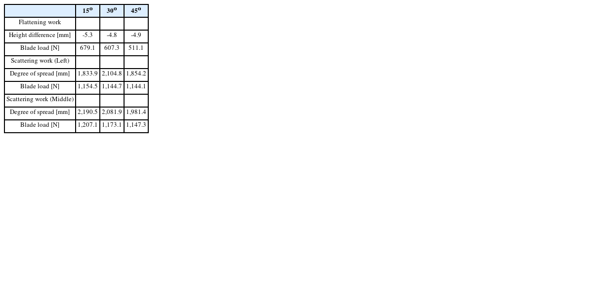 Table 3 shows the simulation results. Work quality showed similar results for all three angles. However, stability received less load as the angle increased. Therefore, setting the blade rotation angle to 45