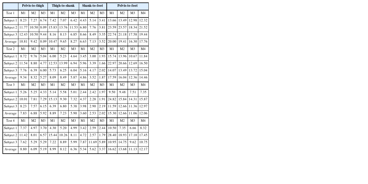 Table 1은 실험에 참가한 3명의 피실험자(Subjects 1-3) 각각에 대해 Tests 1부터 4까지의 각 방법별 분절간 상대위치 추정 평균 RMSE를 보여준다. 각 실험의 RMSE는 학습데이터를 제외한 4개의 시행 데이터에 대한 평균 RMSE이다. M4의 경우 골반에서 발까지의 상대위치를 직접적으로 추정하기 때문에 부분적인 인접 분절간 상대위치에 대한 추정 결과에서는 제외되었다.