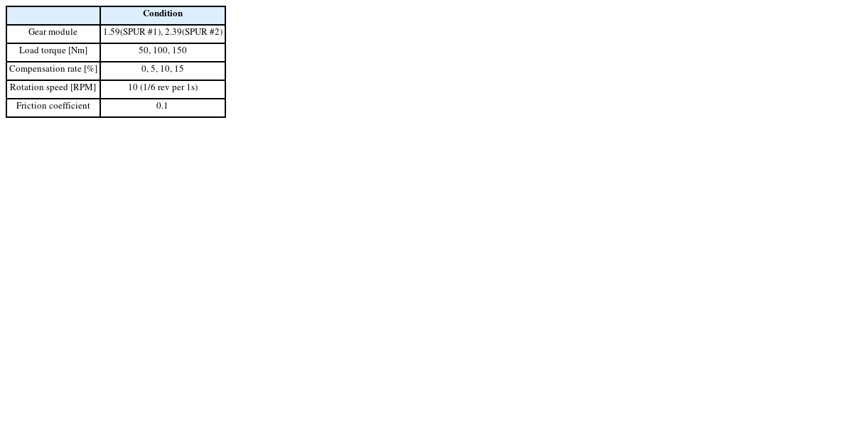 Table 1은 타겟 기어의 제원으로 스퍼 기어 #1은 모듈이 1.59이고, 스퍼 기어 #2는 모듈이 2.39이다. 두 기어에서 모듈이외의 모든 제원은 동일하게 가져가도록 하였다.