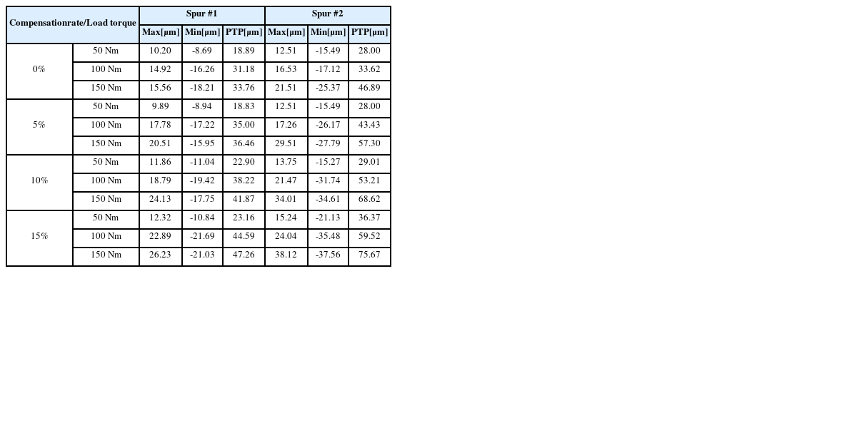 해석과 시험에서의 전달오차 최대진폭값을 비교한 결과로부터 다음을 알 수 있다. 첫째로 전위 비율, 기어 모듈에 비교해서 부하 토크 증가에 가장 민감하게 전달오차 최대진폭이 증가한다. 둘째로 기어 모듈, 전위 비율의 증가에 따라 전달오차 최대진폭값은 비교적 작게 선형적으로 증가한다. 셋째로 기어 물림률과 기어 모듈의 반비례 관계에서 알 수 있듯이 전달오차 최대진폭값은 해석과 시험에서 동일하게 물림률이 큰 스퍼 기어 #1이 전달오차가 작게 나타났다.