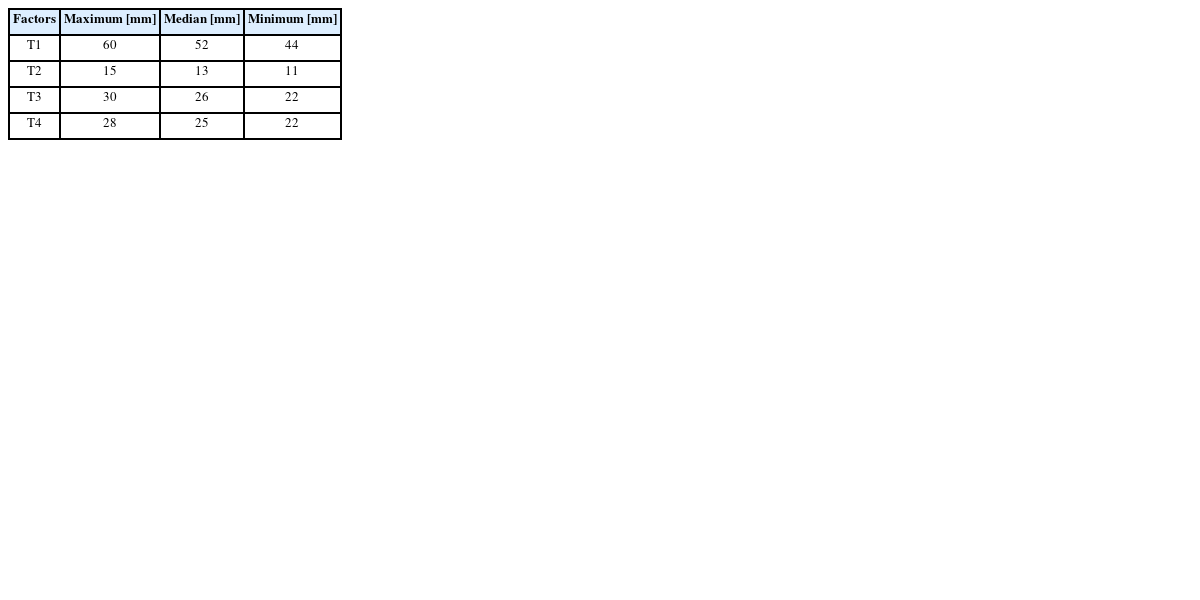 Table 2에서 보는 바와 같이 최솟값(Minimum)은 기존값(Initial) 대비 약 75%의 치수로 설정하였고, 4인자 2 수준의 완전요인배치법을 실시하였다. 여기서 기존값이란 최댓값을 의미한다.