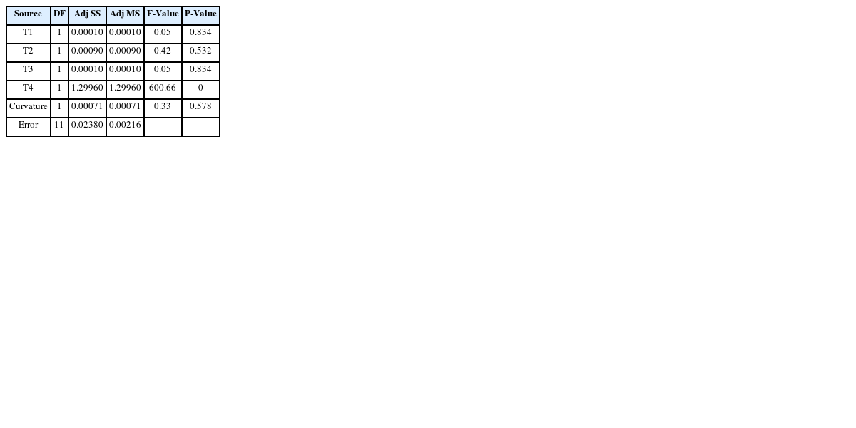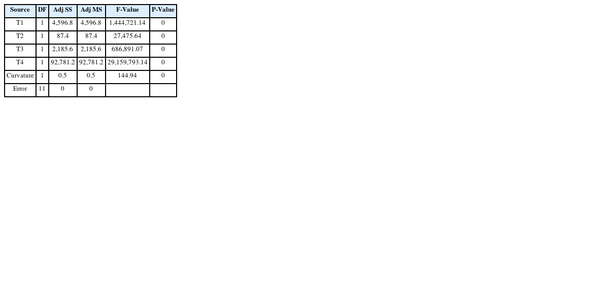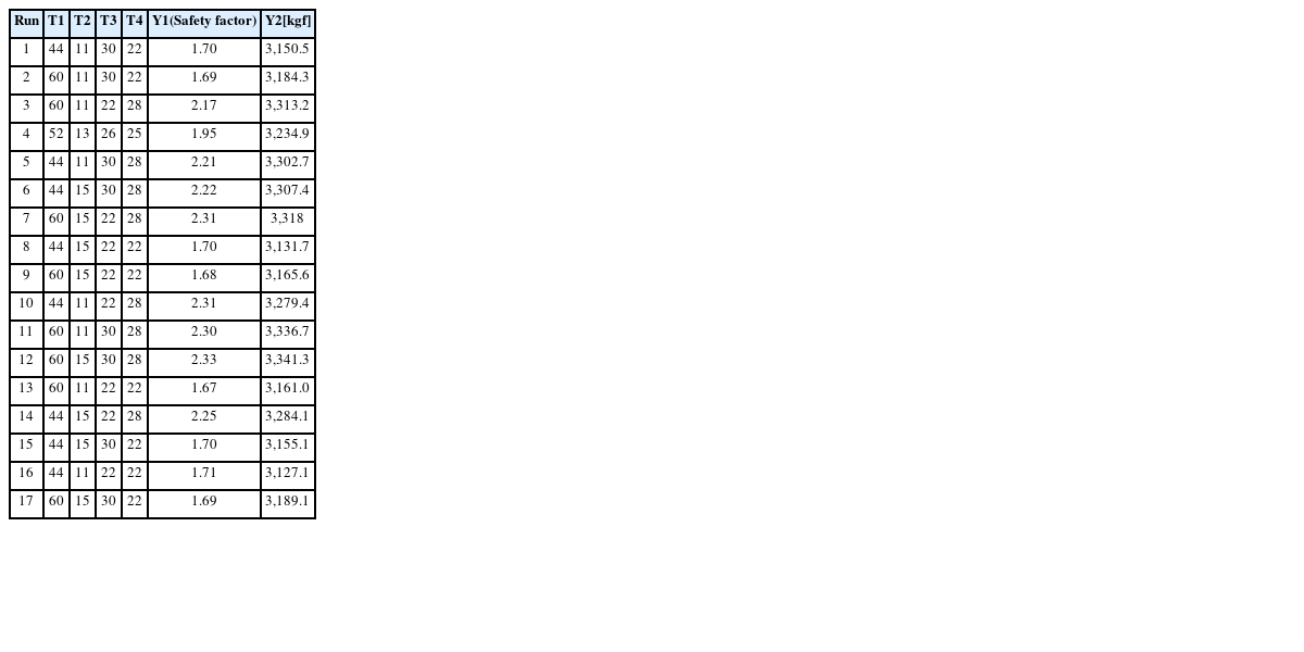 본 논문은 50톤급 유압 브레이커의 하우징을 대상으로 최적 설계를 진행하였다. 완전요인 배치법으로 4인자 2 수준의 설계를 진행하였으며, 반응값인 안전율이 곡면성을 띄는 것을 확인하였다. 완전요인배치법을 통해 곡면성이 확인됨에 따라 고차의 실험인 반응표면분석법을 실시하였으며, 아래와 같은 결과를 얻을 수 있었다.