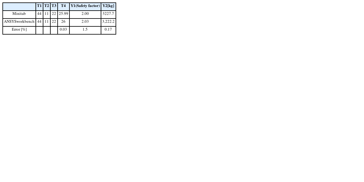 Fig. 12는 유압 브레이커에서 안전율이 낮게 나왔던 하단 부위의 그림이다. Minitab에서 최적화된 T4의 치수는 실제 철판 규격표와 맞추기 위해서 26으로 설정하였다. 이로 인해 중량에 대한 오차와 안전율의 오차가 발생하였다. Minitab에서 예측한 결과 값과 실제 해석한 결과값의 비교는