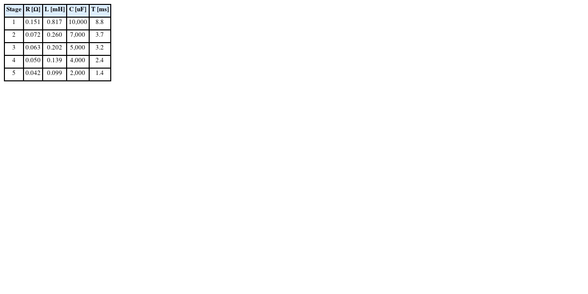 Eq. (5) below. Subsequently, the circuit of each stage was implemented according to the calculated resistance and the capacitor capacity specified as a variable. In addition, the inductance of the solenoid coil was calculated in the Maxwell program.