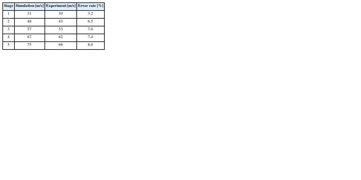 The velocity of the projectile was recorded using a speed measuring device. The errors between the velocity of the projectile and the simulation values by stage from stage 1 to stage 8 were recorded and shown in