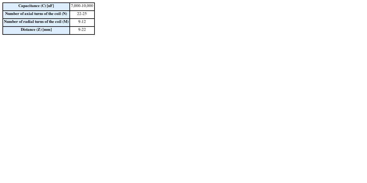 The cycle T of the solenoid coil current is determined by the inductance, resistance, and capacitance of the coil, and the amplitude of the solenoid coil current is determined by the charging voltage and charging capacity of the capacitor. The two elements, solenoid coil and capacitor, determine the cycle in the RLC function. Therefore, the capacitor capacity should be designed along with the turns of the solenoid coil. Since the charging voltage of the capacitor does not affect the cycle, this study didn’t set the charging voltage of the capacitor as a design variable. Instead, the charging voltage of the capacitor was fixed at 400 V because a capacitor with a charging voltage of 400 V was used for the production of the prototype.