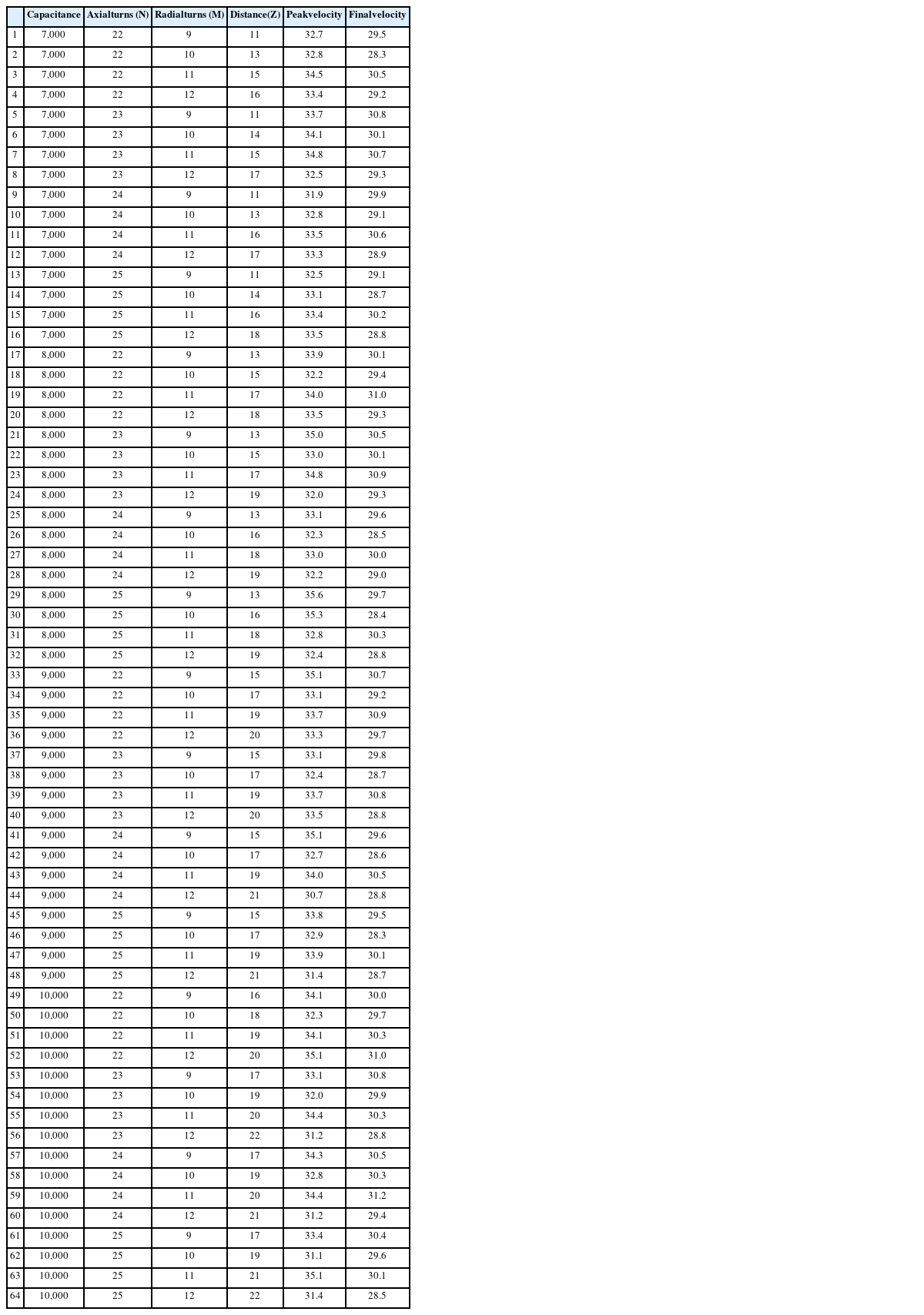 Table 3 shows the experimental points created in an orthogonal arrangement for the design of the first stage of the coil gun and the projectile velocity at each experimental point.