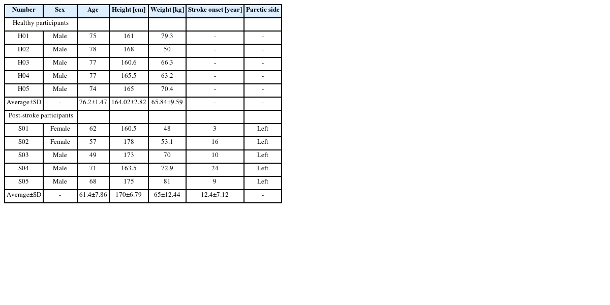 과거 신경계 혹은 근골격계 질환을 앓고 있지 않은 건강한 고령자 5명(74-78세)과 만성 뇌졸중 환자 5명(49-71세)이 실험에 참여하였다. 만성 뇌졸중 환자의 모집 기준은 뇌졸중 발병 이후 6개월 이상 지났으며 보조기구 없이 독립 보행이 가능한 지원자로 제한하였다. 또한 안정상태에서 혈압이 90/60에서 170/90 mmHg 범위를 벗어난 경우와 심한 통증 및 소통 불능인 경우를 배제하는 기준으로 삼았다.