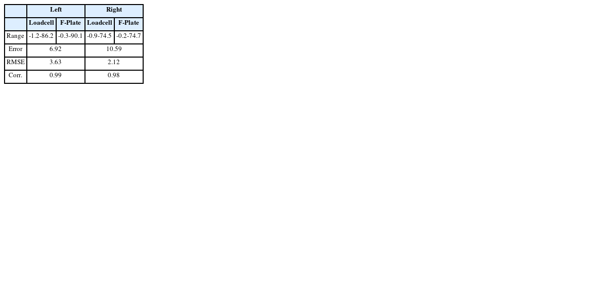 지면반력의 경우 로드셀 또는 압력센서가 삽입되는 인솔과 3차원 동작분석 시스템의 지면 반력기로 측정 및 산출되는 수직축의 힘을 비교 검증하고 있으며, 선행연구의 결과에서는 보행 시점에 따른 힘의 변화량 패턴의 유사도를 나타내는 상관계수가 최소 0.8에서 최대 0.9 수준을 보이고 있다