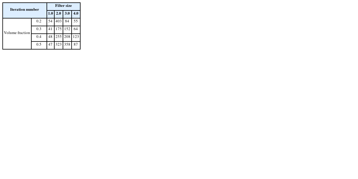 22]를 이용하여 위상최적설계를 수행하였다. 설계의 종료 조건으로 축차(Iteration)간 설계변수 값의 최대 변화량(Tolerance: 0.01)을 사용하였다.
