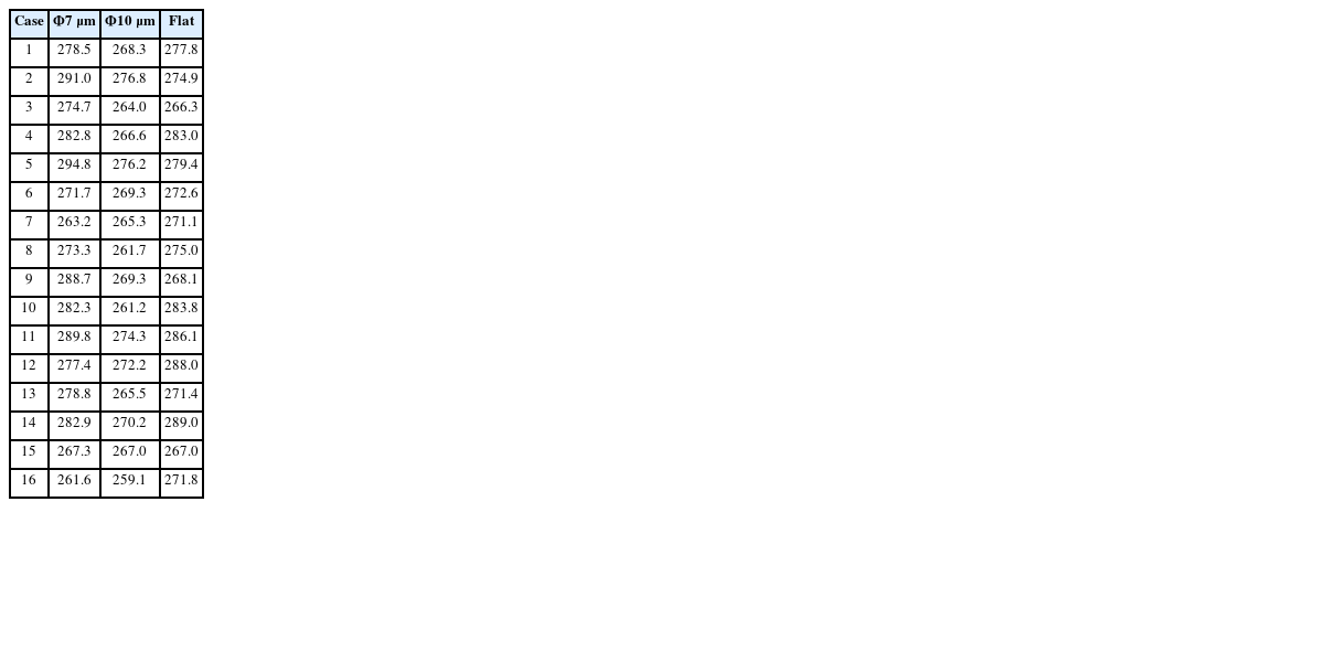 Table 5에서 보는 바와 같이 Φ7 μm SFT가 9.80으로 조건에 대한 영향을 가장 많이 받는 것으로 나타났으며, Flat Type SFT의 표준편차는 7.52로 Φ7 μm보다 조건의 영향을 적게 받음을 알 수 있었다. Φ10 μm SFT는 표준편차가 5.21로 조건 변화에 가장 둔감하였다.