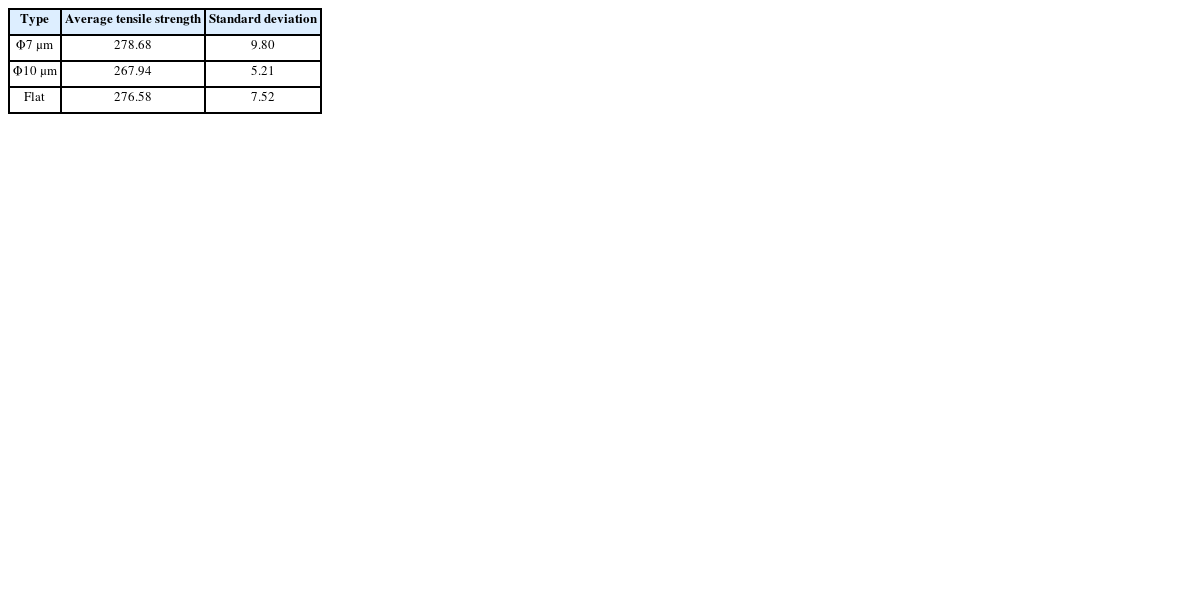 인장강도 평균값은 Φ7 μm SFT가 278.68 MPa로 가장 컸으며, Flat SFT가 276.58 MPa로 Φ7 μm SFT와 유사한 평균값을 가지는 것으로 나타났다. Φ10 μm SFT는 267.94 MPa로 가장 작은 인장강도 값을 가진다는 것을 확인할 수 있었다.