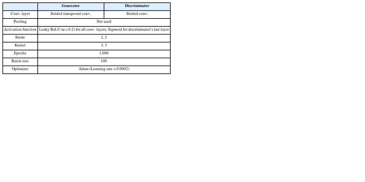 Table 9 (cGAN-2DCNN)의 데이터셋을 학습하였다. 두 모델은 학습 데이터를 제외하고 모두 동일한 조건(Epochs, Optimizer, Learning rate, Architecture)에서 학습되었다.
