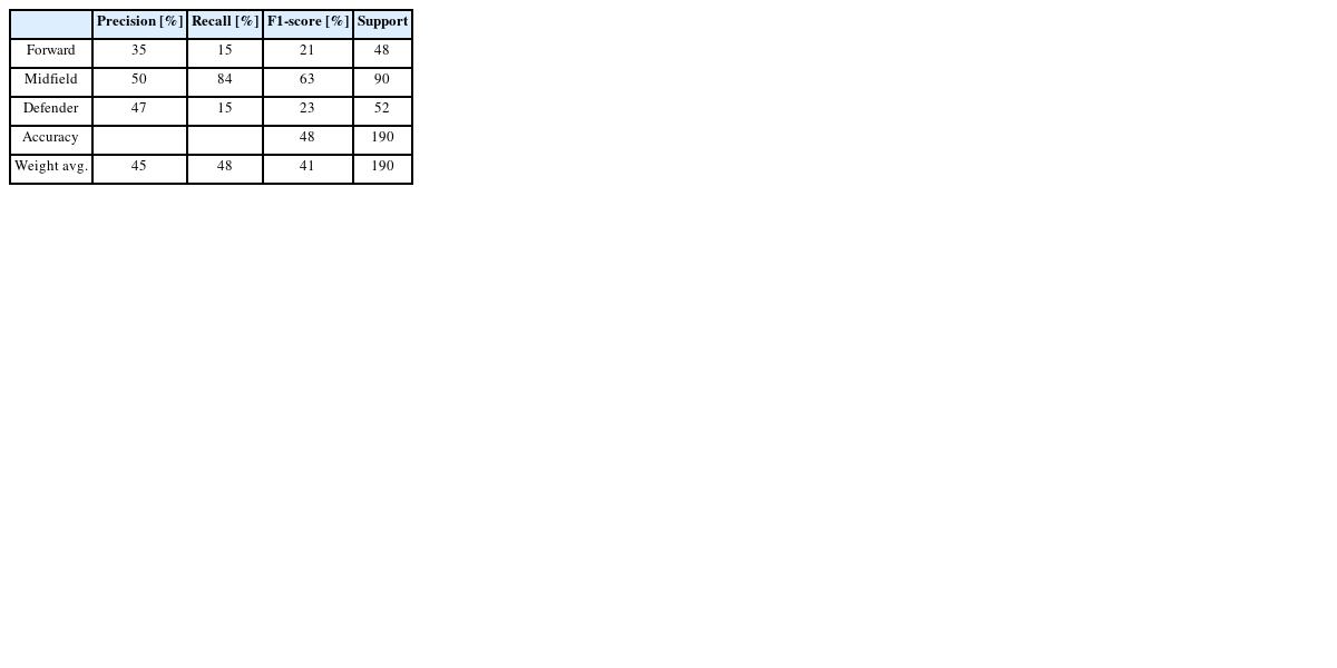 팀 스포츠경기에서 포지션은 경기장에서 자신의 위치이며, 위치에 따른 행동능력이 요구된다. 필드하키는 11명이 경기에 들어가서 각자의 포지션에 맞게 경기를 하지만, 축구와 달리 오프사이드가 없어 공격수와 미드필드 선수들은 상대 수비수의 위치에 관계없이 빈공간을 찾아서 움직인다. 이러한 특성 때문에 데이터에서 Forward와 Midfield의 데이터 차이가 분류되지 못했기 때문에 Forward의 Recall 값이 낮게 나온 것으로 사료된다.
