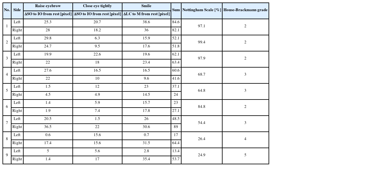 Table 4와 같이 좌우 각각에 대한 움직임 등급, 안면 대칭 정도와 그에 따른 HBGS 등급을 표시하고 기존 NS 스케일과 비교하여 그 차이를 확인했다.