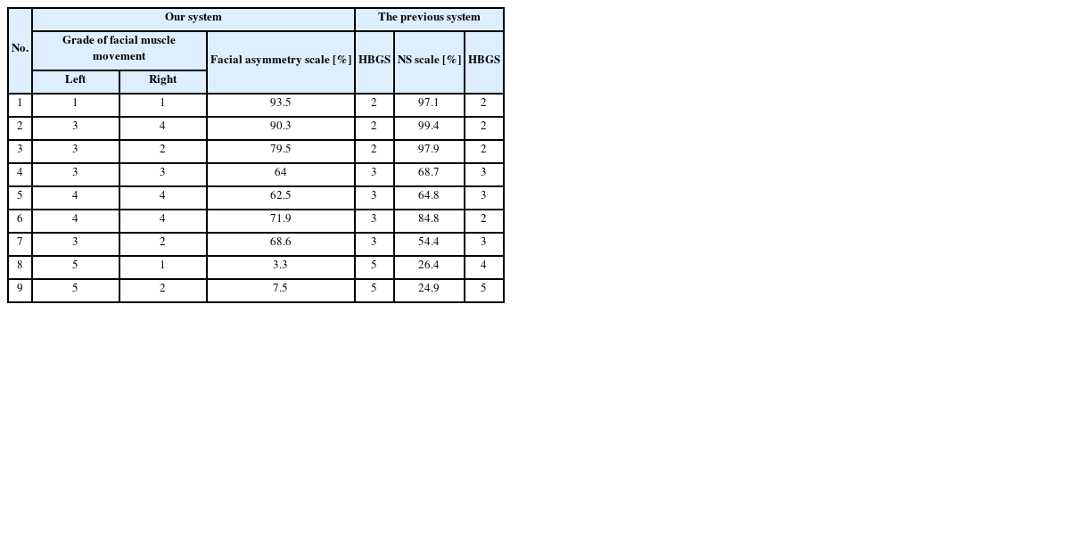 Table 1에서와 같이 확인하였다. 그러나 6번 환자 모델의 경우 중추성 안면마비 환자 모델이지만 NS 스케일이 높게 측정되어 HBGS 또한 높게 나타나는 오류가 발생하는 것을 확인할 수 있었다.