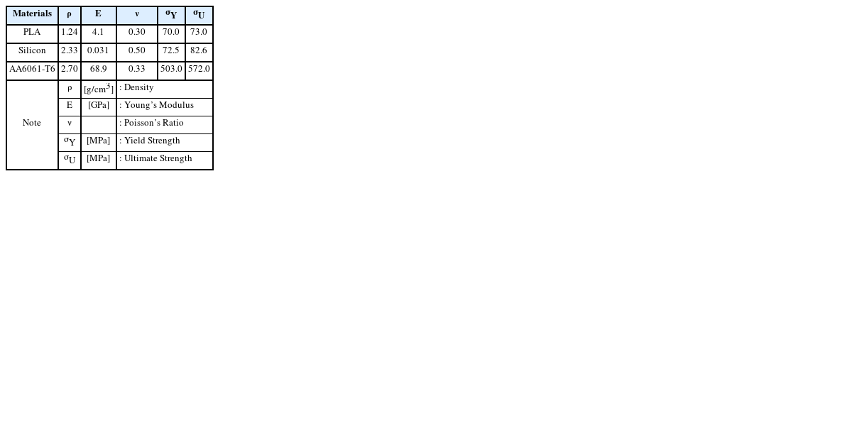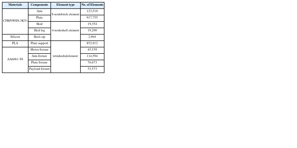 Table 1에 요약하여 나타내었다. 메인 프레임 및 사이드 멤버의 각 구성 부품들에 대한 유한요소 모델링에 있어서, CFRP 소재가 적용된 부품들(Arm, Plate)은 육면체 요소(8-node Brick Element)로 이산화하였고, PLA와 AA6061-T6 재료가 사용된 부품들(Plate Support, Fixture)에 대한 요소 분할에는 사면체 요소(Tetrahedral Element)가 적용되었고, 스키드 및 스키드 레그 그리고 캡 부품은 쉘(4-node Shell) 요소로 모델링하였고, ABAQUS 6.14 상용 소프트웨어를 사용하여 구조건전성 검토를 위한 구조해석을 수행하였다. 이와 더불어, 각 소재별 재료 물성들은
