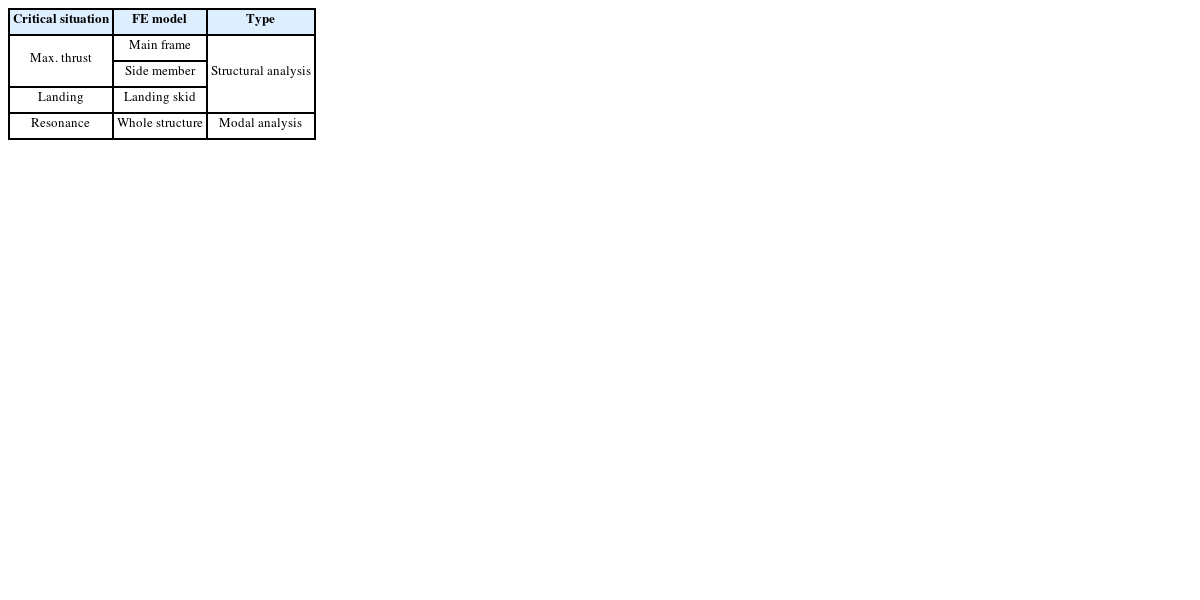 [2]. 본 연구에서는 해당 소형 카고 드론에 대한 설계 단계에서의 구조건전성 검토를 통해 구조적 취약부를 사전에 확인하고, 개선 설계 방안을 도출하고자 하였다. 우선, 초기 설계된 소형 카고 드론의 구조건전성을 확인하기 위해, 최대 추력이 작용하는 경우와 착륙하는 과정에 대한 3차원 유한요소 구조해석을