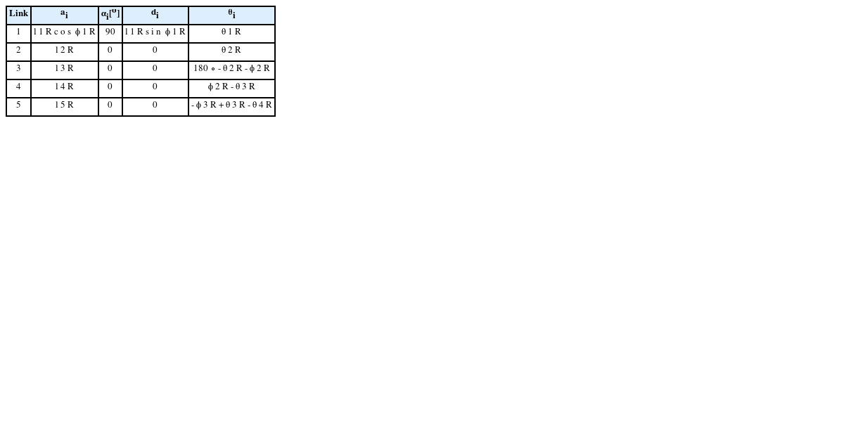 Table 1의 파라미터들을 대입하면 식 (2)와 같이 전체 변환행렬을 구할 수 있다. 여기서
