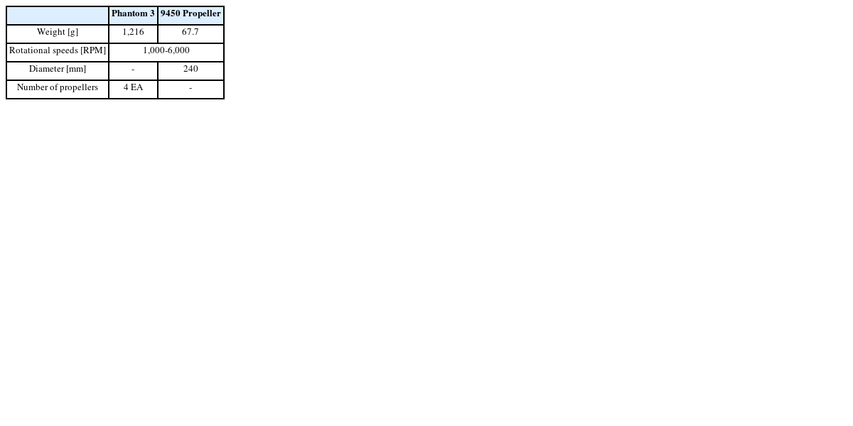 본 연구에서는 D(社)의 Phantom 3 드론을 활용하여 연구를 진행하였으며 Phantom 3 드론은 쿼드로터(Quad-rotor) 방식으로 직경(D)이 240 mm인 9450 프로펠러를 사용한다. Phantom 3와 9450 프로펠러의 상세한 제원은