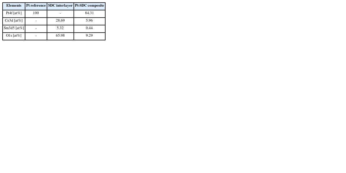 Table 1은 스퍼터링 기법으로 증착한 Pt Reference, SDC 기능층, Pt-SDC 복합 환원극의 원소 조성비를 나타낸다. Pt Reference의 환원극과 Pt-SDC Composite 환원극의 두께가 동일할 때 백금의 함량을 15% 이상 줄일 수 있는 것으로 확인되며 복합 환원극 내 사마륨 도핑 세리아의 조성 비율을 알 수 있다.