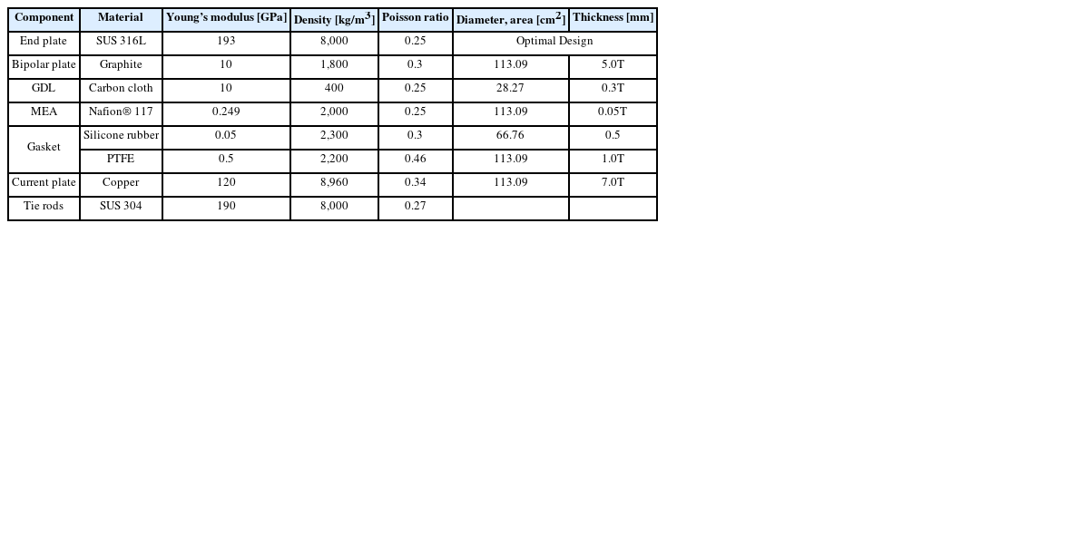 6]. Zhou et al.은 양성자 교환막 연료전지(PEMFC)의 기계적 상태를 예측하기 위한 복합모델과 재료 특성 등가를 기반으로 유한요소모델(FEM)을 사용하여 스택 시스템을 모델링했다. 유한요소모델의 정확성을 검증하기 위해 스탬프 처리된 분리판(Bipolar Plate)을 사용한 실험을 수행하였다[