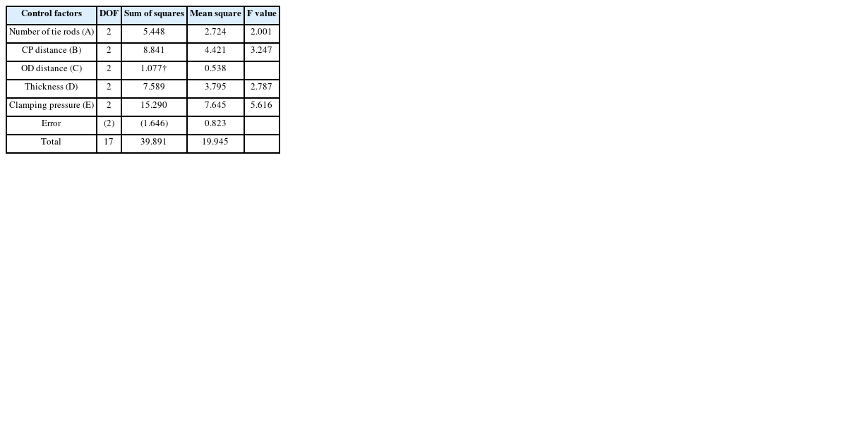 7]. 엔드플레이트의 안전성을 유지하고 스택 내부 압력을 지탱하는 Tie Rod의 Size와 개수는 스택 내부의 압력(300 Bar)을 버틸 수 있도록 안전률까지 고려하여 결정하였다. 이 연구에서 Tie Rod Nominal Size가 M16, 개수 8개를 수준 1로, Tie Rod Nominal Size를 M12, Tie Rod개수 14개를 2 수준으로, Tie Rod Nominal Size M10, 개수 20개를 3 수준으로 선정하였다. 부적절한 Tie rod Size와 개수는 시스템의 안정성 문제를 초래할 수 있다. 엔드플레이트의 외경, 활성화 면적 최대활용 및 Tie Rods 배치에 영향을 주는 항목인 Current Plate Distance, Outer Diameter Distance는 활성화면적을 고려하여 Current Plate Distance, Outer Diameter Distance가 최소치인 경우에도 Tie Rod 간의 배치배열을 이룰 수 있도록 각각의 수준을 결정하였다. 엔드플레이트 구조강도와 무게에 영향을 주는 항목인 엔드플레이트의 두께는 임의로 75 mm를 1수준으로 하였고 25 mm씩 늘어나도록 각각의 수준을 결정하였다. 엔드플레이트의 봉인 및 압축과정에서 필요한 압력 제어에 영향을 주는 항목인 Clamping Pressure도 제시된 값이 없기 때문에 스택 내부에서 발생하는 압력을 같은 값을 1수준으로 하였고 5 MPa씩 늘어나도록 각각의 수준을 결정하였다.