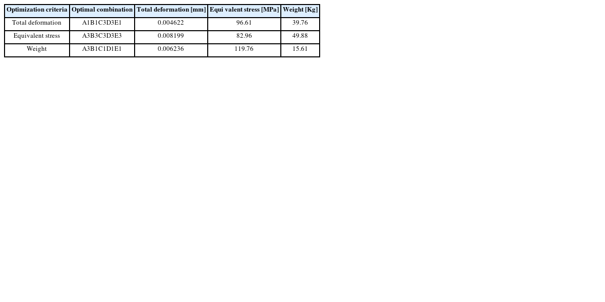 13]. 즉 먼저 다구치 방법으로 무게 최적화와 변형과 응력 최소화를 각각 실시하고 각각의 목적함수에 가중치를 설정하여 그때의 파라미터를 결정하는 방법을 이용하였다. 여기서 응력은 엔드플레이트에 작용하는 최대 Von Mises 응력을 채택하였다.