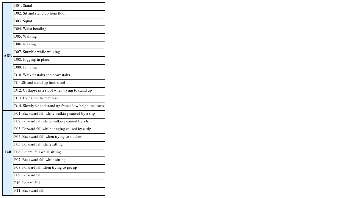 본 연구의 실험 동작은 11개의 일상 생활 동작(ADL)과 14개의 낙상 동작(Fall)으로 구성 되어있으며, 각 동작들은 피험자 당 3회씩 반복 측정하였다(