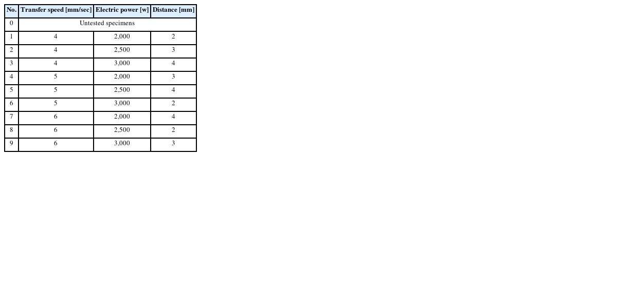 3이며 설계인자는 이송속도, 전력, 시편과 코일 간의 간격으로 설정하였다. 시험 조건은 다구찌 실험계획법에 근거하여 도출하였으며 도출된 시험조건은 9개의 시편에 적용하였다. 열처리 효과는 준비된 시편에 대해 규정된 시험조건으로 열처리한 후 일정 간격 떨어진 8개 지점에서의 경도를 측정하여 검증하였다.