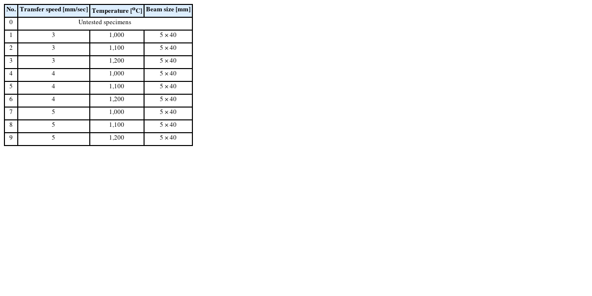 3이며 설계인자는 이송 속도, 온도, 빔 크기로 설정하였다. 시험 조건은 고주파 유도 열처리 시험에서와 마찬가지로 다구찌 실험계획법에 근거하여 도출하였다. 본 연구에서는 빔 크기의 경우 시편의 형상과 너비를 고려하여 5 × 40 mm로 고정하였으며 각 시험 조건을 적용하기 위해 9개의 시편을 준비하였다. 열처리 효과는 준비된 시편에 대해 규정된 시험 조건으로 열처리한 후 일정 간격 떨어진 8개 지점에서의 경도를 측정하여 검증하였다.