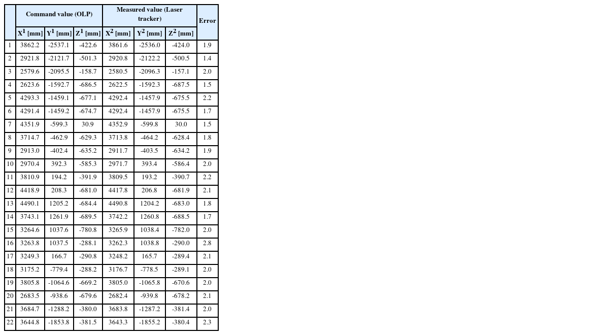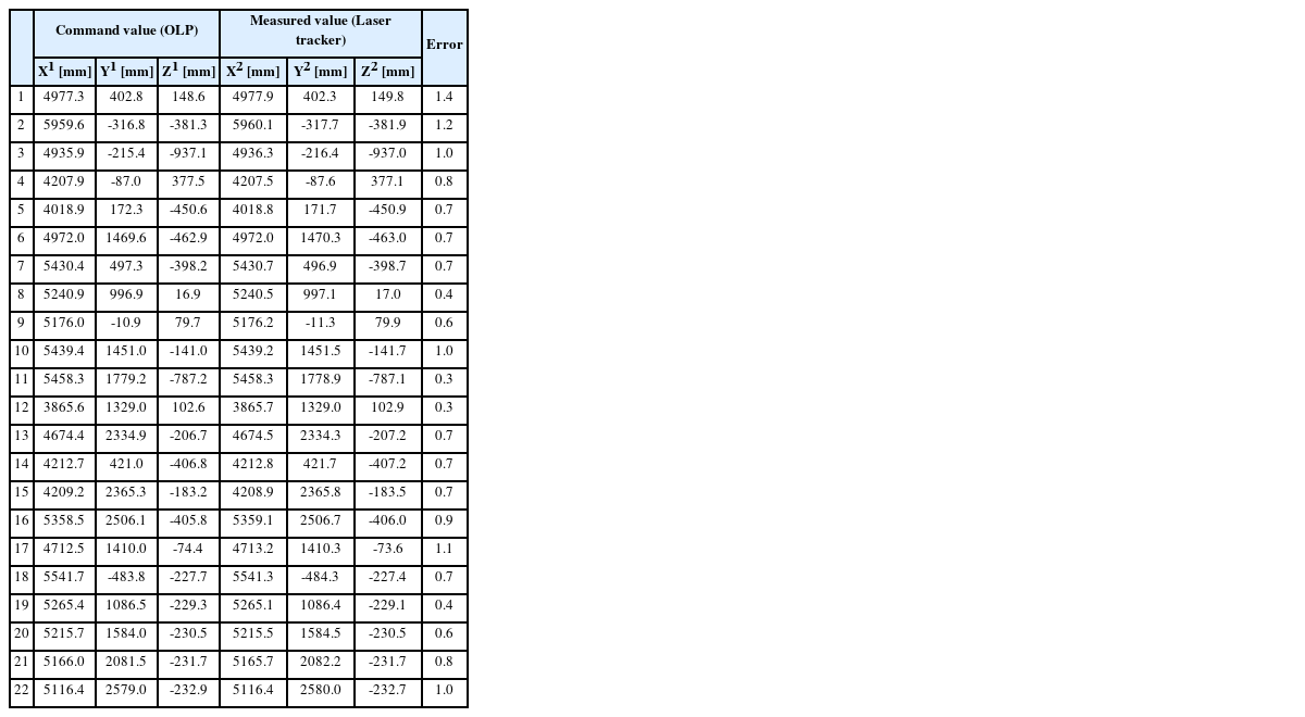 4. 가상 환경과 실제 환경 사이의 위치 오차 보정이 적용된 OLP 기반의 열처리 로봇 교시시간은 기존의 로봇 교시시간보다 40-56% 단축시킬 수 있었다.