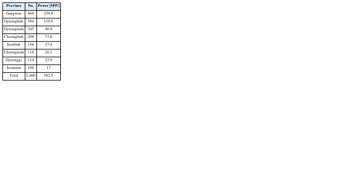 Table 1, obtained through a small hydropower site survey by the Ministry of Science and Technology and the Korea Atomic Energy Research Institute in 1974, shows 2,400 potential development areas with a total estimated capacity of 582.5 MW in South Korea. And