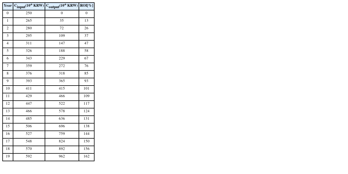 From 10 years after construction, the total revenue starts to exceed the total investment cost, meaning Coutput > Cinput. Therefore, it takes 10 years after the new construction and normal operation to begin recovering the investment cost, and after that, profit is generated. After 15 years, the project starts to generate more than 50% profit of the initial investment cost. Thus, based on this study, the payback period for the construction cost of 250 billion won is 10 years.