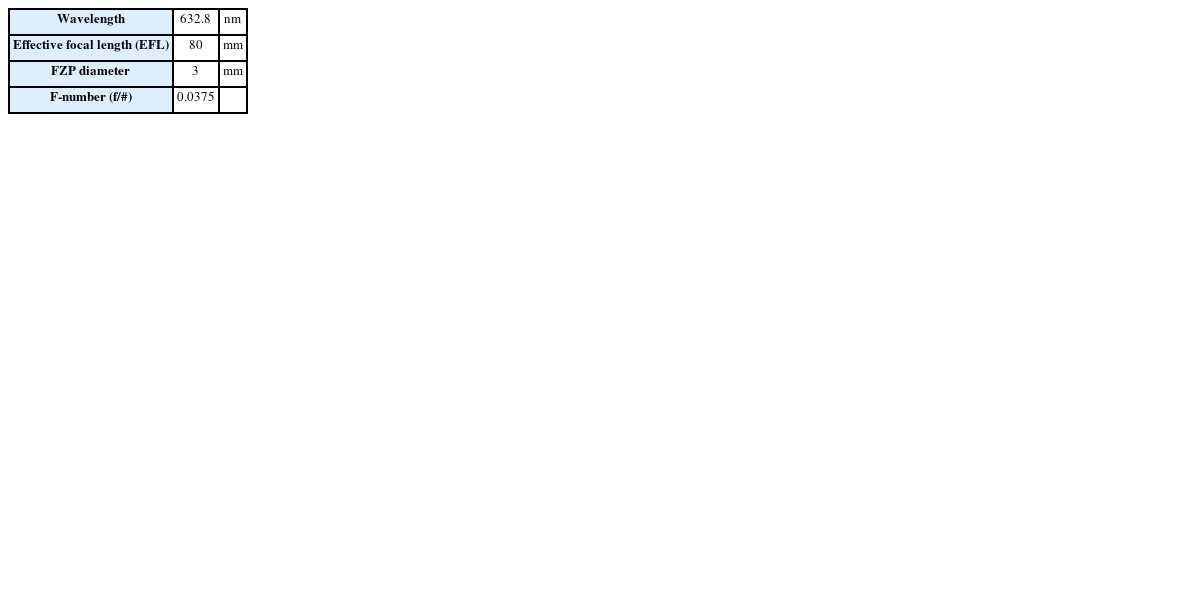 Fig. 3(a) shows the ZEMAX simulation configuration in which the surface phase with a size of 3 mm diameter represents the FZP pattern. We use the 5 terms of polynomial expansion of the surface phase as optimization parameters of the default merit function for spot radius. Besides, the EFFL operand is added to constrain the 80 mm of focal length, and the RWCE operand is used to optimize the RMS wavefront error with a target of 0; Both are considered with the weight factor of 1 shown in