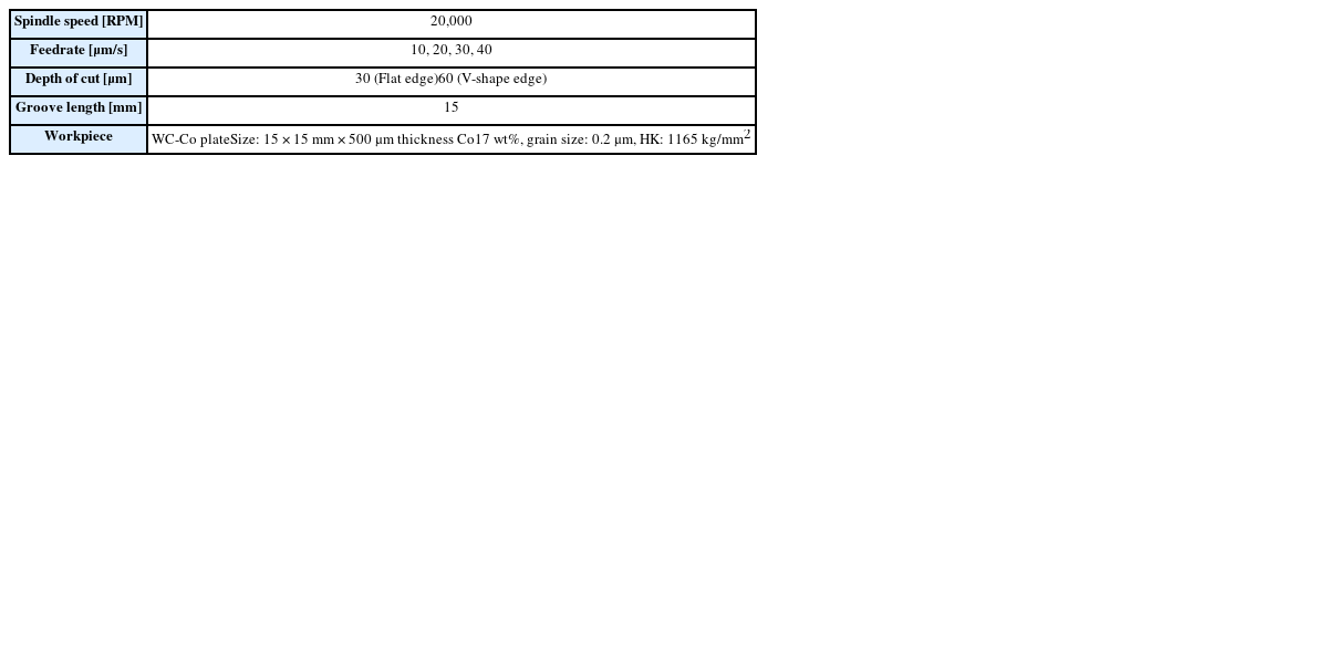 2, 두께 1 mm의 초경합금 판재를 사용하였다. 공구 회전 속도는 20,000 RPM, 공구 이송속도는 10-40 μm/sec으로 설정하였으며, 가공 깊이는 사각 디스크 공구의 경우 30 μm, V형 디스크 공구는 60 μm으로 설정하여 가공하였다. 가공 과정에서 마찰로 인한 저항을 줄이고 칩의 배출을 위해 절삭유를 사용하였다. 자세한 가공 조건은
