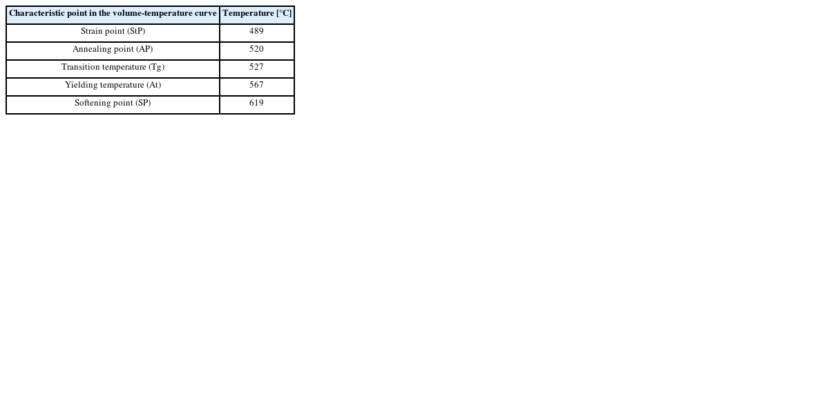Table 1에 나타냈다. 변형점(StP)은 렌즈의 열팽창과 수축이 가장 민감한 온도이며, 이 온도 이하에서 유리 변형이 최소화된다. 어닐링 포인트(AP)는 렌즈를 가열하여 재료분자 구조를 재정렬하는 온도이다. 전이 온도(Tg)는 렌즈의 용융물의 부피가 느린 속도로 감소되는 온도이며, 유리 렌즈 성형은 항상 이 온도 이상에서 진행되어야 한다. 항복 온도(At)는 유리가 최대 팽창과 상대적으로 낮은 가소성에 도달하고 수축하기 시작하는 온도이다. 연화점(SP)은 유리가 액체처럼 거동하는 온도이다[
