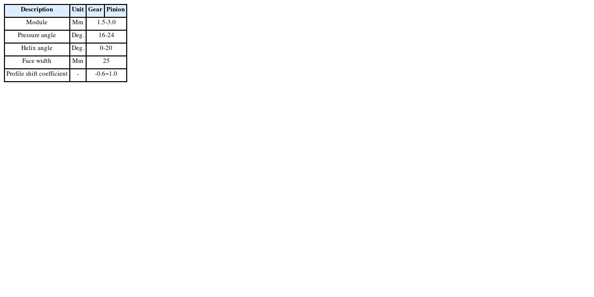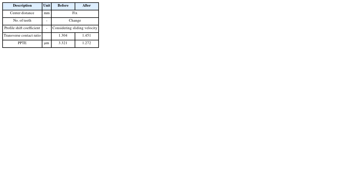 Table 2와 같다. 이 설계에서는 저소음을 고려하여 기어의 잇수를 증가시키고, 비틀림 각은 고정하였다. 전위계수는 미끄럼 속도(Sliding Velocity)를 고려한 설계로 치접촉(Tooth Contact)을 증가시켰다.
