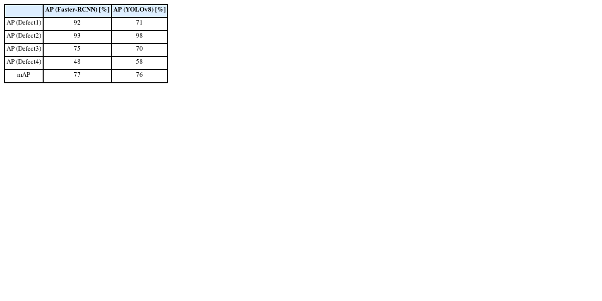 Defect 1의 경우 AP가 Faster R-CNN과 YOLOv8의 차이가 가장 큰 것으로 확인되었다. 이는 Defect 1의 크기가 비슷하여 Faster R-CNN에서 풀링을 통한 피처 맵의 크기를 제안하는 과정에서 효율적이기 때문에 Faster R-CNN에서 YOLOv8보다 높은 AP 값을 도출함을 확인하였다.