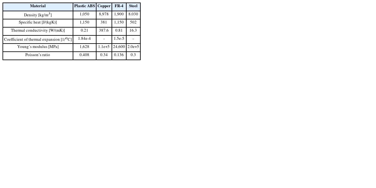 Table 1에 나타냈다. IC칩은 Plastic ABS 재질을 적용했으며, 코일은 Copper를 사용하였고 PCB는 FR-4 소재를 도입하였다. PCM은 온도에 따라 액체 상태와 고체 상태로 상변화를 일으키는 소재이다. 따라서 온도에 따라 고체상과 액체상의 물성을 각각 적용하였다. PCM 물성은