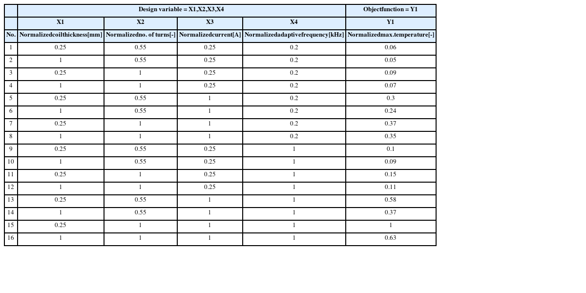 oC를 목표로 설계변수를 판별하였다. 설계변수는 코일의 구조적으로 변경이 가능한 권선 수와 두께, 변경이 가능한 전압과 주파수를 설계변수 X1, X2, X3 그리고 X4로 지정하였다. 또한
