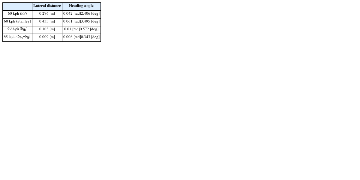 Table 7Lateral distance error and heading angle error RMS at vehicle speed of 20-60 kph in Town05
