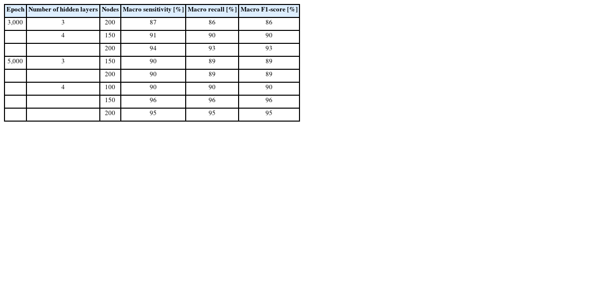 머신러닝을 이용한 다중클래스 분류의 결과 11개의 MLP 모델 중 에포크 5000, 히든 레이어 3개, 노드 200개인 경우가 정확도가 높고