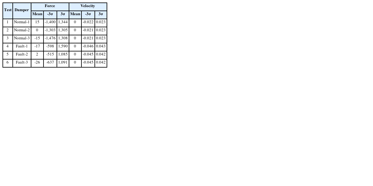 Table 2의 감쇠력 결과를 보면, 정상댐퍼의 경우, 평균, 표준편차 값은 시험 1, 2, 3 모두 유사하고 균일한 값을 보이고 있다. 반면 비정상댐퍼의 결과 시험 4, 5, 6은 정상댐퍼에 비하여 표준편차 값에서 정상댐퍼와 명확하게 차이가 나는 결과를 보이고 있다. 압축방향 감쇠력이 적게 발생하여 인장, 압축 감쇠력이 비대칭적으로 발생하고 있다. 특히, 분포의 하한값인 -3σ에 해당하는 감쇠력이 작게 발생하고 있다. 이 결과는 비정상댐퍼가 오일이 누수된 상태를 모사한 결과로