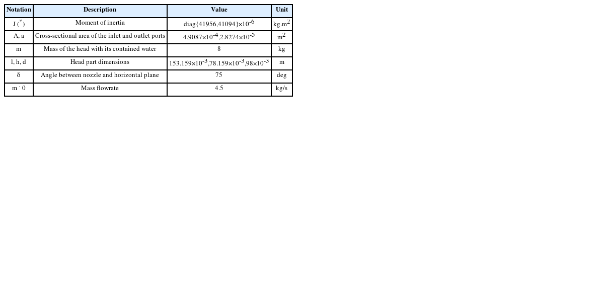 Here, the term R∙2∙1 represents the rotation matrix with ∙1 and ∙2 the rotation axis and the rotation angle, respectively; Vi denotes the axial velocity of the water flowing out at the ith nozzle’s outlet. Moreover, the term R¯∙2∙1 is the rotation matrix of the nozzles about yb-axis, and is written by: