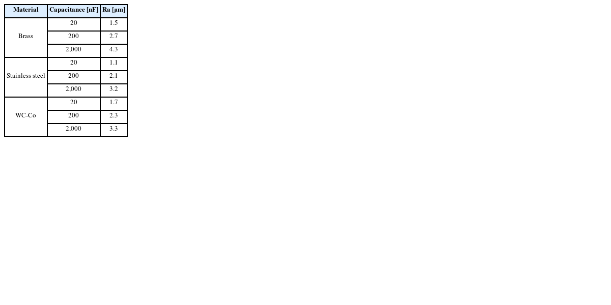 Table 2는 가공물 재료와 축전용량에 따른 표면거칠기(Average Roughness, Ra) 값을 나타낸다.