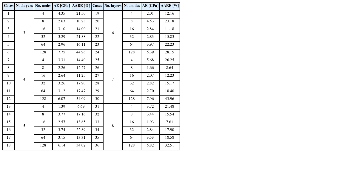 Table 2에 나타내었다. 모델 성능에 대한 검토 결과, 5개의 층수와 4개의 노드를 갖는 모델이 가장 높은 정확도를 보임을 확인하였다. (AE: 1.39 GPa, AARE: 6.69%).