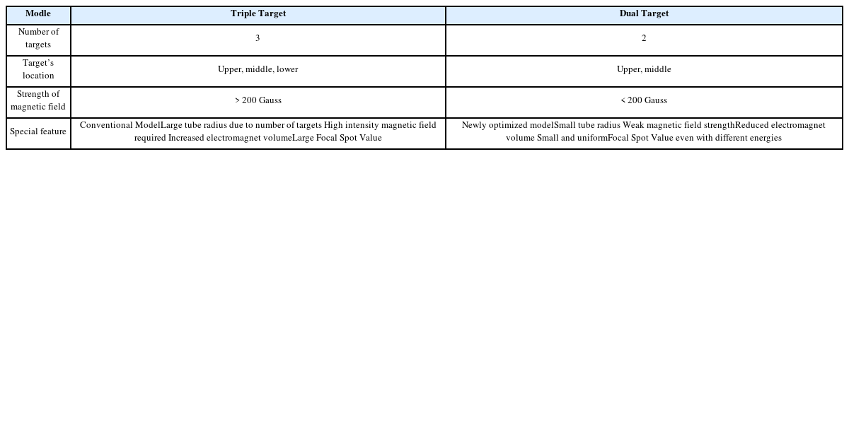 Table 1은 Triple Target과 Dual Target을 비교하였다. 단일 Target의 투입된 kV보다 X-ray 생성량이 낮고 많은 에너지가 열로 변환되는 단점이 있으며, Triple Target은 Target의 경우 튜브 자체의 반경이 커지고 타깃 사이의 거리가 멀어져 강한 자기장이 요구된다. 강한 세기의 자기장을 위해서는 전자석의 부피가 증가해, 자기장이 Focal Spot Size에 영향을 주어 에너지에 따라 균일한 Focal Spot Value를 얻는 것이 어려워진다. 이러한 문제를 고려하여 Target수를 2개로 줄인 Dual Target X-ray Tube를 개발하였다.