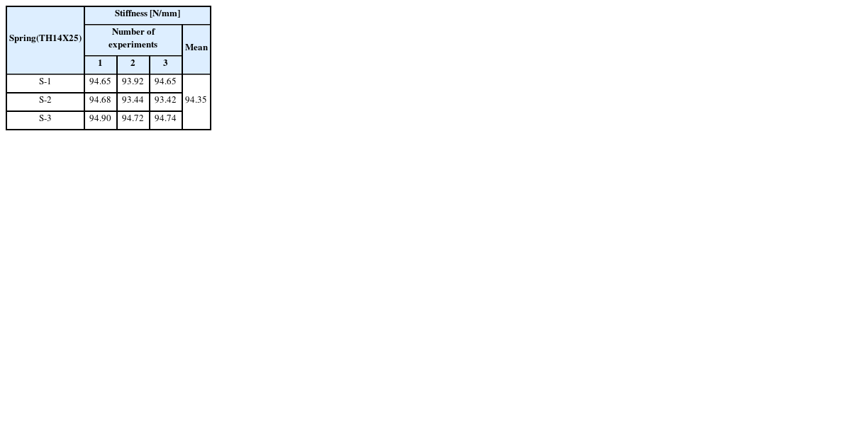 Table 2과 같이 강성을 얻었다. 측정된 강성의 전체 평균은 94.35, 표준편차는 0.59 N/mm이다. 제조사에서 제공하는 강성 96.30 N/mm를 참값으로 가정하였을 때 오차율은 2.03%이다. 전체적으로 참값보다 강성이 모두 낮게 측정되어 상대적으로 정확도는 낮지만, 측정된 강성의 분포가 모여 있어 높은 정밀도로 측정되는 것을 확인하였다. 강성이 참값보다 낮게 측정된 원인은 용수철의 제조 오차나 측정 시 용수철을 지그와 정확히 동축에 장착하지 못하여 발생할 수 있을 것으로 예상된다. 용수철의 강성 측 시 발생한 문제는 플렉스플라인 전용 지그를 제작하여 힘이 항상 같은 위치에 가해질 수 있도록 하였다.